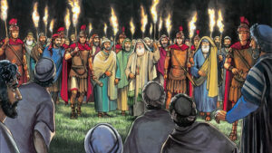 „Und als Jesus nach Jerusalem hinaufzog, nahm er die zwölf Jünger auf dem Weg beiseite und sprach zu ihnen: Siehe, wir ziehen hinauf nach Jerusalem, und der Sohn des Menschen wird den obersten Priestern und Schriftgelehrten ausgeliefert werden, und sie werden ihn zum Tod verurteilen und werden ihn den Heiden ausliefern, damit diese ihn verspotten und geißeln und kreuzigen; und am dritten Tag wird er auferstehen.“